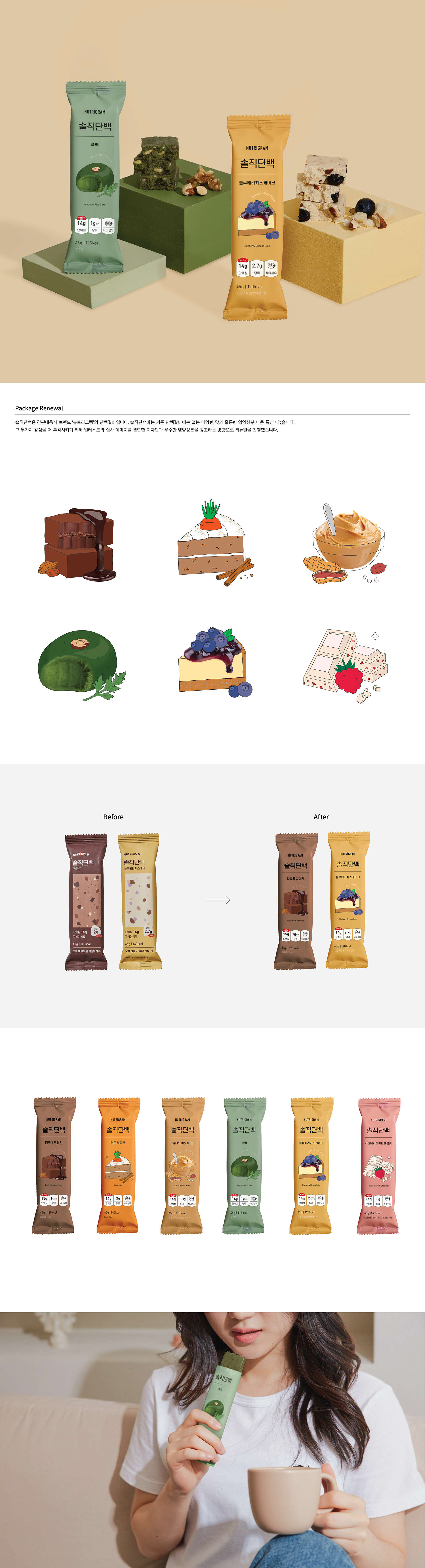 먹음직스러워 보이는, 단백질바 같지 않은 단백질바를 목표로 디자인을 진행했습니다.