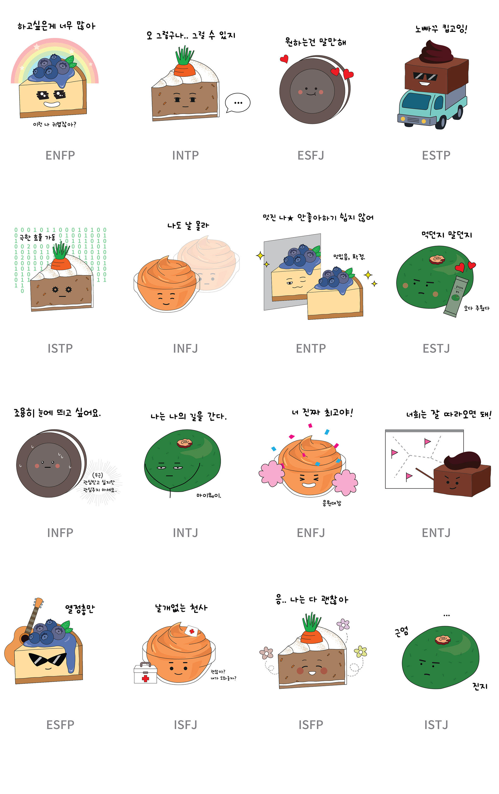 단백질바 맛을 바탕으로한 캐릭터 16종을 작업했습니다.